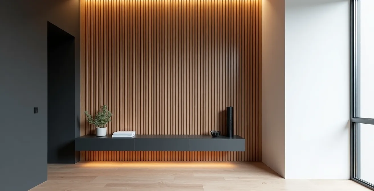 Le mur de lattes de bois est une des techniques les plus efficaces pour corriger la perception d’une pièce étroite. L’illusion d’optique repose sur un principe simple : les lignes verticales fortes forcent le regard à balayer de bas en haut, créant une sensation de hauteur et de grandeur. Dans un couloir ou une chambre étroite, un tel mur d’accent, placé sur l’un des longs murs, peut visuellement « soulever » un plafond qui semble trop bas et donner une impression d’espace plus aéré. La texture du bois ajoute également une chaleur et une profondeur que la peinture seule ne peut offrir, créant un point focal à la fois organique et structuré.